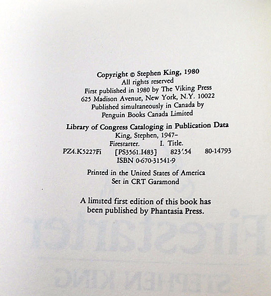 NOTE: The Phantasia Press limited edition is in fact the true world 1st printing of Firestarter, predating the Viking trade edition by several months, and is referenced on the Viking edition copyright page.