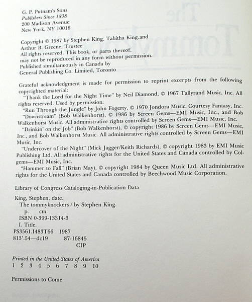 ITommyknockers would have the 1st and 2nd States - (250,000 of the Gold author name and 250,000 of the red author name state with the "Permissions to Come" line on the CP page- and then the publisher was updated with the acquired permissions and ran an additional 500,000, divided the same between the red and the gold).